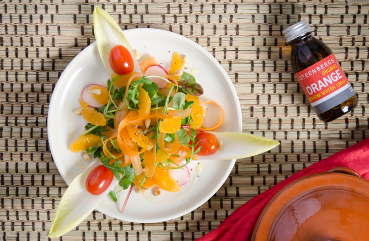 Our organic Orange Blossom Water is a delicate floral extract widely used in Middle Eastern cookery in both sweet and savoury dishes. Often used for flavouring marzipan and madeleines, it’s delicious in homemade ice creams, custards and creams. We’ve used it here in a light, summery salad which goes perfectly with Dukkah encrusted Lamb Chops.