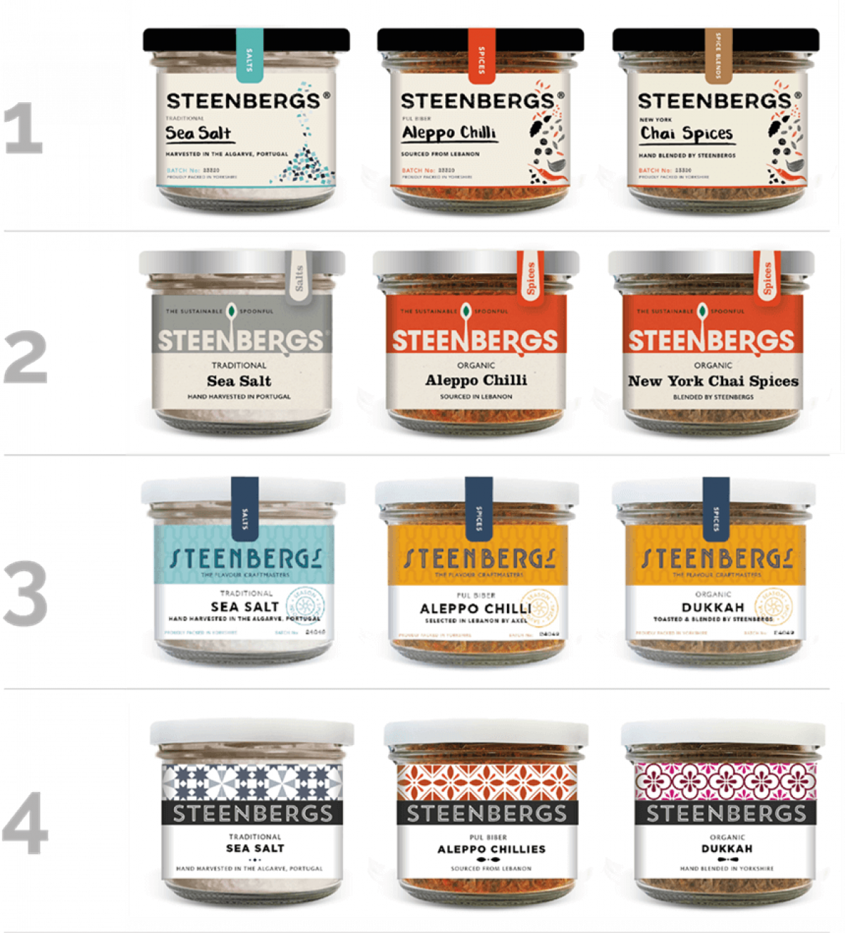 It was tricky to narrow the options down as we liked quite a few! We spent a long time considering our favoured options - which ones worked best with how we saw Steenbergs and which options best communicated the idea behind the brand.