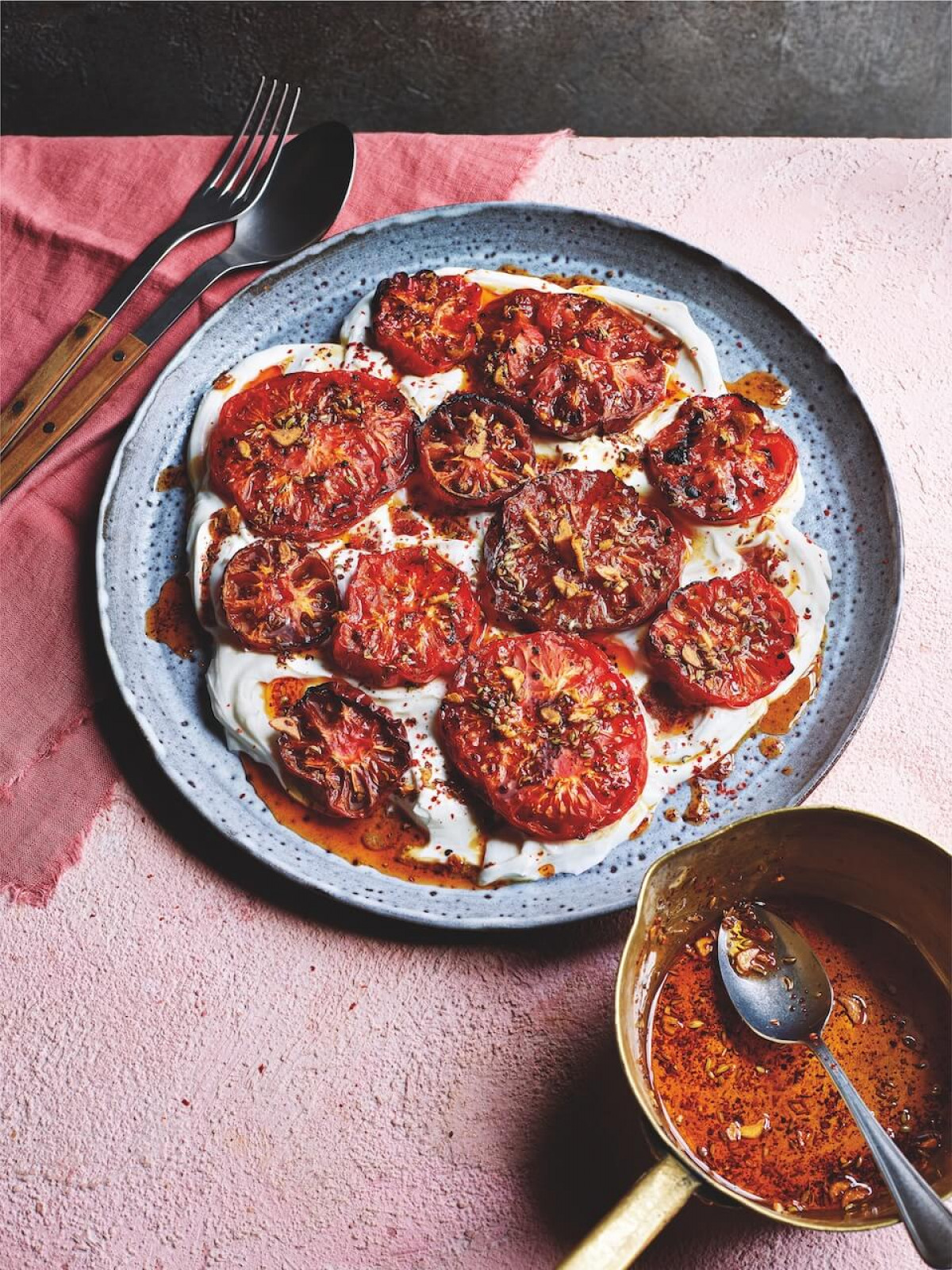 "One of the most classic Persian accompaniments is the whole flame-roasted tomato. A staple served with every kebab, it’s simply made by placing a whole tomato on a charcoal grill and roasting until the skin is somewhat charred in parts and the soft flesh inside is bursting with juices. This dish is inspired by my love for the roasted tomato, but reimagined for indoor cooking. Served with labneh (which Persians serve with everything) and a little spice oil for adding depth and flavour, it really is a wonderful dish and perfect alongside roasted or barbecued meats and vegetables."