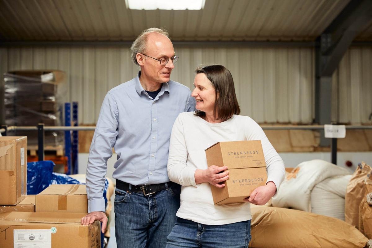 We’re Axel and Sophie Steenberg. The name’s not German, and we’re not Dutch or South African, but Danish originally. Axel’s family came from the small Danish Island of Bornholm, but his great-great grandfather emigrated to Hartlepool in 1855, then moved to Newcastle in 1860. His family hasn’t moved far, and he was brought up just outside of town in the Tyne valley. Yes, he and Jamie support Newcastle United and have season tickets in the Leazes End. Sophie was brought up in Gloucestershire. They met at Edinburgh Uni. After a short time in North London, they moved to Boroughbridge in North Yorkshire, got married and started a family, and at the same time started Steenbergs. Their children, Jamie and Poppy, are often found working in Steenbergs – Jamie helps in packing and Poppy does dispatch and order processing, but Jamie is currently at Portsmouth Uni, does a lot of football scouting in his spare time, and Poppy is a home care worker in Easingwold, working from 6am – 10pm, and sometimes works in one of York’s vaccine centres on her days’ off.