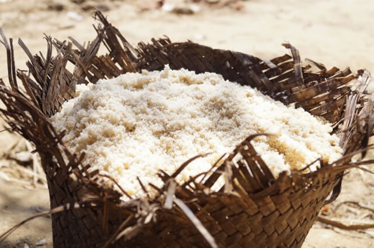 To make a batch of siratany, water is mixed with buckets of soil (scraped from the surface of areas with high soil salinity, near local rivers and streams), tipped on to a special mat made from woven reeds that is suspended from a wooden frame. A hollowed-out log is placed under the suspended mat to collect the salty water that slowly filters through. This water is then transferred into a shallow pan, which is heated over a wood fire to increase the water’s salinity through evaporation. Once the salt precipitates out of the water, the crystals are dried. Siratany production occurs primarily during the dry season, as it is difficult to obtain soil with sufficiently high salt content when the river floods during the wet season.