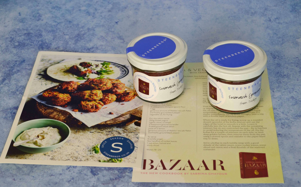 Some of you will have received a bonus in your Steenbergs order recently – an exclusive recipe card from Bazaar! We were delighted to highlight one of Sabrina’s delicious recipes and you’ll also see an ‘as featured in Bazaar’ sticker on some of the key spices that feature in the book: sumac, nigella seeds, turmeric, oregano, pul biber/Aleppo chilli flakes, and cinnamon.